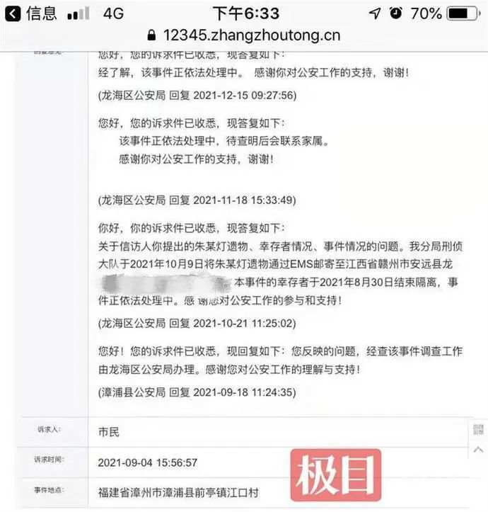 9月,朱先生將該訴求通過漳州12345反映,漳浦縣公安局于9月18日回復(fù)稱,該事件的調(diào)查工作由龍海區(qū)公安局辦理;10月21日龍海區(qū)公安局辦理回復(fù)道,朱小光的遺物已郵寄至其江西老家,事件中的幸存者于8月30日解除隔離,事件正依法處理中;龍海區(qū)公安局在11月18日和12月15日回復(fù)稱“該事件正在依法處理”。