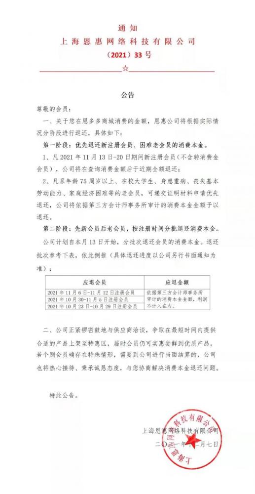 12月7日,恩多多發(fā)布了一則有關返還消費金額的公告。公告稱,公司將根據(jù)實際情況分階段進行分批返還。12月13日,楊晨收到了由恩多多發(fā)出的947.05元退款。