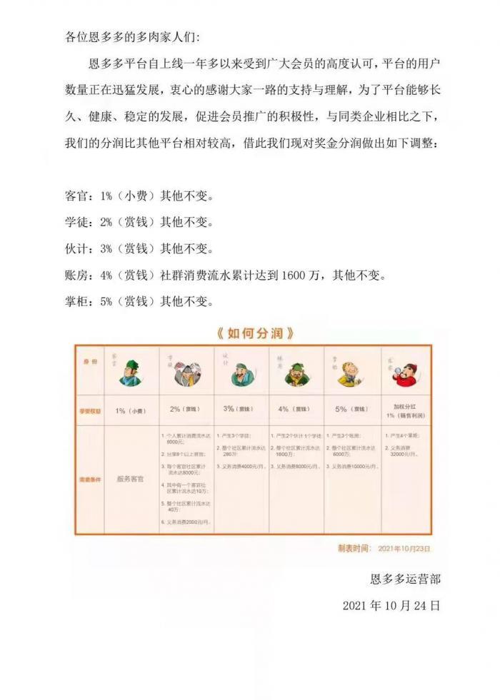 此外,邱山提供的一份“會員推廣”資料顯示,平臺會員分成客官、學徒、伙計、賬房、掌柜五級,不同等級對應不同比例的獎金分潤,文件署名為恩多多運營部。