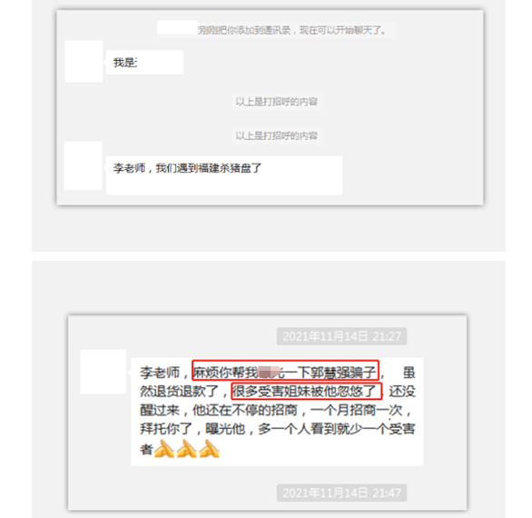 “成功人士”添加好友→噓寒問暖引導(dǎo)進群→分享成功經(jīng)驗→群托烘托氛圍→誘導(dǎo)加盟→代理變終端消費者→騙子銷聲匿跡,這就是殺豬盤代理加盟的整套流程。