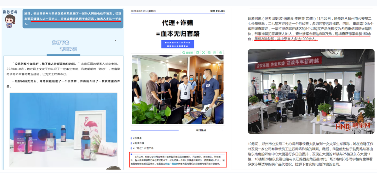 在設(shè)立騙局之前,詐騙團伙會先注冊公司,這些公司主要集中在福州、深圳、廈門等地,找生產(chǎn)企業(yè)制定特有的產(chǎn)品,詐騙團伙在短視頻、社交等平臺,被陌生網(wǎng)友添加好友,通過殺豬盤套路,誘騙女性投資參與各種產(chǎn)品的代理加盟騙局,少著損失幾千元,多著損失十幾萬元。