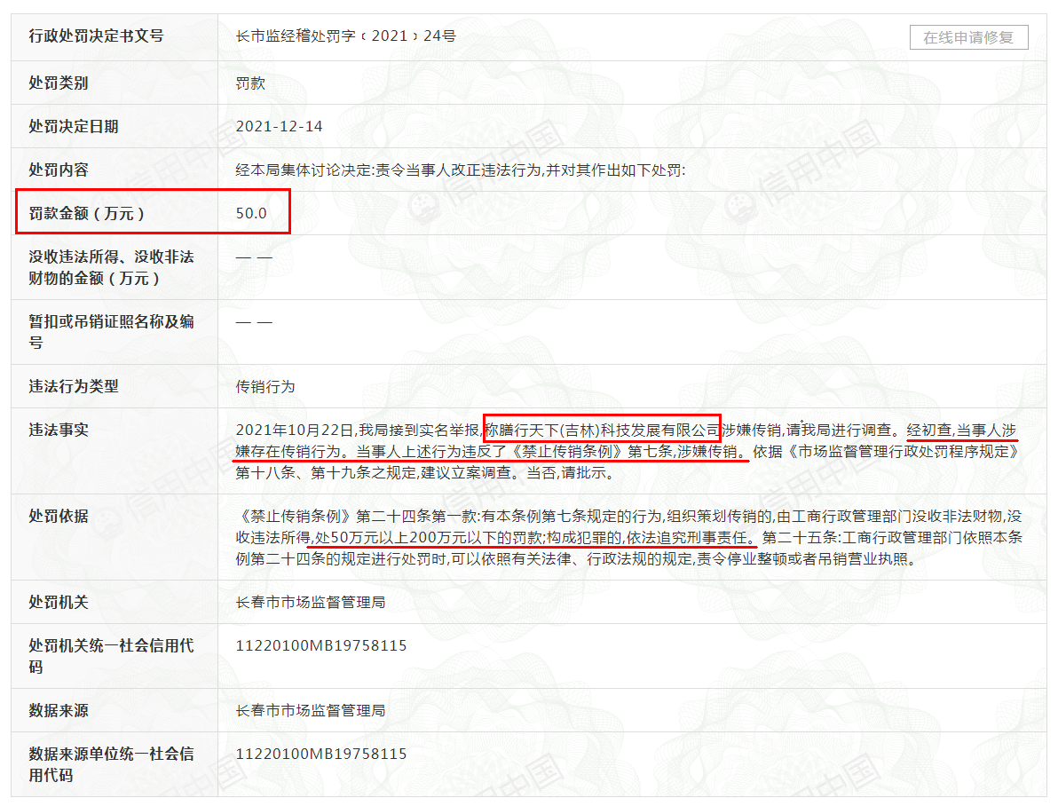 膳行天下(吉林)科技發(fā)展有限公司因傳銷被罰款50萬(wàn)元