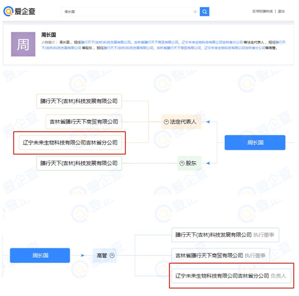 小編通過(guò)愛(ài)企查獲悉,周長(zhǎng)國(guó)還是直銷公司遼寧未來(lái)生物科技有限公司吉林省分公司的負(fù)責(zé)人。