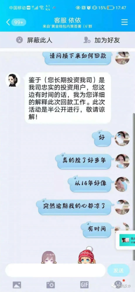騙子冒充平臺(tái)客服用短信、郵件聯(lián)系投資者,稱要給他們退款,提出加微信群、QQ群,隨后實(shí)施詐騙。