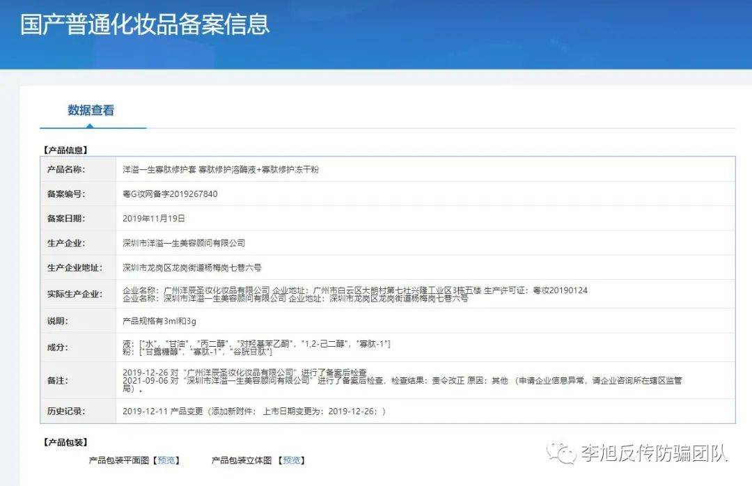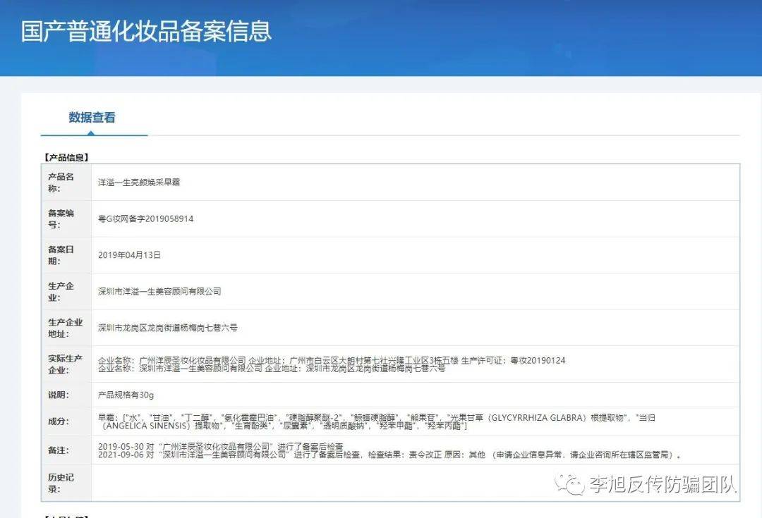 “洋溢一生”品牌公司全稱為“廣州洋溢一生化妝品有限公司”,宣稱可打造素顏美女,公司主打祛斑、美白類產(chǎn)品。該公司于2016年成立,法定代表人為陳正貴,最大股東陳小群。