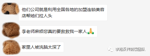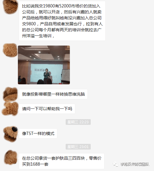 近日,李旭反傳防騙團(tuán)隊(duì)又接到一位網(wǎng)友的求助,稱其家人加入了一個(gè)名為“洋溢一生”的化妝品品牌,目前已經(jīng)投入了十幾萬進(jìn)去。網(wǎng)友表示,該團(tuán)隊(duì)跟TST模式類似,公司利用全國各地的加盟連鎖美容店幫他們拉人頭。網(wǎng)友懷疑其模式或涉嫌傳銷。