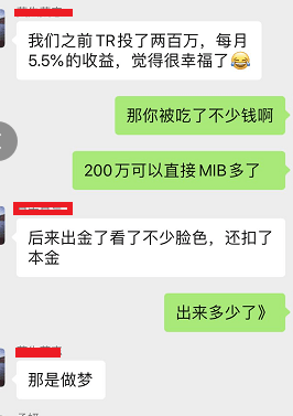 發(fā)表時間:2022-03-14 21:52作者:知乎——資金盤的前世今生來源:知乎——資金盤的前世今生 TR外匯 (現(xiàn)在名字是:全球資產(chǎn)配置 之前名字叫過 實惠資產(chǎn) 4xhub pricemarkets 紅磚快訊 等等) 這是一個慢盤玩法的資金盤,下面慢慢講。 這就是TR外匯(現(xiàn)名稱 全球資產(chǎn)配置)的登錄界面。 就是一個網(wǎng)頁,網(wǎng)址是你的上家發(fā)給你的。你什么都不需要做,就是拿著身份證 開個戶,把錢轉(zhuǎn)給你的上家,你就變成外匯經(jīng)紀(jì)人了,你就是賣保險還得考個 保險經(jīng)紀(jì)人證呢。外匯經(jīng)紀(jì)人,TR幫你分分鐘實現(xiàn)。 如果你想掙更多的錢,那么拉著你的親朋好友,舉著身份證和錢,一起加入把。 ![]() 這就是登錄界面 ![]() 這是可以看到下級的出入金情況 ![]() 這是托管賬戶的頁面 很多團隊長都在撤銷托管準(zhǔn)備離場了 但是他不會告訴下面的人 下面開始講一下這個資金盤慢盤的玩法: ![]() 這是收入的明細(xì) 看看你從下家那里掙了多少錢進自己口袋 1 玩命給自己貼金。自號稱有pricematkets在英國FCA的監(jiān)管,有4xhub在澳大利亞ASIC的監(jiān)管。 號稱老板陳日尊又控股這個,又收購那個的。所有的一切,都是為了讓你放下戒備,把你的真金白銀送進去 真實情況:你作為投資人,你的錢是轉(zhuǎn)給你的上家,或者你上家指定的私人賬號。那些監(jiān)管都是真實存在的。但是和收你錢的賬號,收你錢的平臺沒有任何關(guān)系。不停給你講監(jiān)管,就是當(dāng)你查詢發(fā)現(xiàn)監(jiān)管是真的時候,讓你相信他們說的所有一切。但是那些監(jiān)管和你從事的事情,沒有任何一絲絲關(guān)系。不要再去糾結(jié)和質(zhì)疑任何的監(jiān)管,都和你沒有關(guān)系。 頭頭們給自己貼金的辦法: 1 開辦工作室,喝喝茶。發(fā)發(fā)朋友圈,炫耀一下悠閑的生活。先從周圍親戚朋友熟人同事之間開始,忽悠你拿著身份證和錢加入。監(jiān)管什么的,說一大堆。主要就是讓你相信,躺掙。 2 買豪車。買豪車像買白菜。什么帕拉梅拉 什么川崎 什么各種別墅隨便買。然后嘲諷一下那些辛苦做實業(yè)或者勤懇工作的人。 3 聚會,吃喝玩樂。整天發(fā)外匯相關(guān)的文章,文章內(nèi)容都是真的,但是不能因為發(fā)的文章是真的,你就當(dāng)TR也是真的在進行外匯實盤交易。反正這里面所有的錢,都是下級送上來的。送錢的越多,各個級別頭頭們得到的利益就越大。 4 開大會找典型案例做分享打雞血什么的早都過時了,現(xiàn)在流行找真實案例做真情分享。花錢請講師都不如真實案例來的打動人心。什么走頭無路逆襲的 什么寶媽在家?guī)抻帜軖赍X的 什么自己拿錢砸個級別的。 什么為了做這個夫妻反目,最后另一半也加入的。你說這些案例真實嗎 ?案例肯定是真實的, 盤子就是故意 讓一部分先富起來, 只有這樣才能,讓他們做榜樣 做活廣告, 吸引新人加進來。但是崩盤那一天,榜樣們?nèi)绻邢录?,照樣是逃脫不掉法律的制裁的,而且還要倒吐很多錢給下家以及繳納國家罰金。 5 傳承,TR居然告訴會員,自己死了可以把賬號傳承給兒子。 那是不是人死了,就不需要進行PIB和MIB的考核了?不考核 就各種辦法降低收入?,F(xiàn)在所有地區(qū)的PIB必須進行考核,MIB的考核,現(xiàn)在只有部分地區(qū)在執(zhí)行,有的MIB的考核是在當(dāng)上MIB 兩個月之后才會被告知 6 網(wǎng)上TR外匯負(fù)面消息太多了,所以現(xiàn)在改名叫:全球資產(chǎn)配置。這完全就是一個通用詞語啊,不容易被搜索到了。但是MT5服務(wù)器的登錄服務(wù)器,依然是TechReal (TR)。海外的公司名字依然沒有改變。中文名字 TR外匯 實惠資產(chǎn) 紅磚快訊 4xhub ,再到現(xiàn)在的全球資產(chǎn)配置。沒有一個準(zhǔn)確固定的名字,出了問題找違法主體都很困難。到時候,誰收錢抓誰是一定的。 7 不設(shè)立公司統(tǒng)一收款賬號,大部分資金完全在國內(nèi)團隊長和上下級之間流動,這個是慢盤的常見最狡猾的玩法。最大好處是操盤 手可以很好的隱蔽自己,躲避偵察,而且他只需要接受個別國內(nèi)頭頭轉(zhuǎn)上來的錢,不需要對接太多人,新人入的金,就被國內(nèi)的頭頭用作給自己的交易盈利收益,流水收益和給下級的收益了。其他部分交給最上級的陳日尊。投資人的錢對私轉(zhuǎn)給上級,上級給你一串所謂的U錢包里的數(shù)字,你就成了外匯投資人了,然后每周對私給你轉(zhuǎn)收益,號稱直接幫你兌換成人民幣。團隊長每個月5號還所謂的領(lǐng)工資。 8 各個級別團隊長不停的給TR叫好,展示收入和財力,這本身就是TR要達到的效果,相當(dāng)于花錢給自己打活廣告。 而且能做到團隊長的人,要么從親戚朋友開始拉人(借家人朋友身份證開設(shè)多級賬號是最常見的作法,然后有了真正的新人加入的時候,就把自己家人的賬號或者賬號里的u賣給新人,然后自己拿回一個賬號的本金自己留下,這樣就可以迅速的吃新人的流水。還不占用自己的本金。),要么有之前的行業(yè)的人脈,要么有一定的演講說服能力,花點錢找這樣的人給自己打活廣告,真是最頂級的招聘人才的成功案例。其實你要看明白,這樣的人在從事其他行業(yè)的時候,他也不會做的差,只不過他誤入歧途被利益蒙蔽了眼睛進入了TR這個資金盤當(dāng)了棋子。 高收益,是最考驗人性的地方,最讓你著迷的