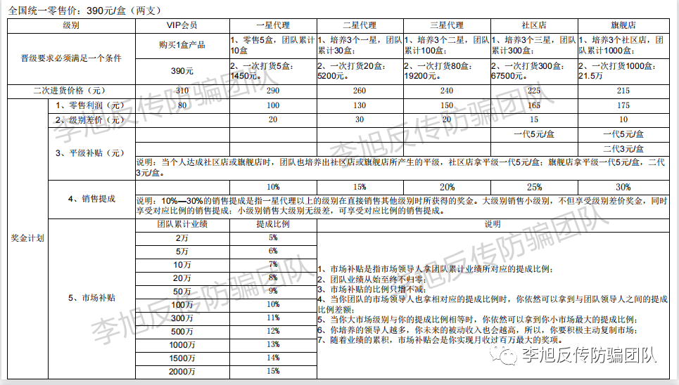 李四表示,該公司利用一件代發(fā),多層級(jí)分潤(rùn)層層有層層有獎(jiǎng)金,拉人頭沖卡位方式,發(fā)展下線。只要零售一盒或者拉一個(gè)星級(jí)代理,上家,上家的上家,上上家,無(wú)窮層可以拿獎(jiǎng)金。李四臥底在代理群發(fā)現(xiàn),這些所謂的代理商每天跟打了雞血一樣發(fā)圈,誰(shuí)誰(shuí)誰(shuí)賺了多少,誰(shuí)誰(shuí)誰(shuí)買車買房了……與諸多被曝光和被處罰的涉?zhèn)髌髽I(yè)營(yíng)銷模式類似。
