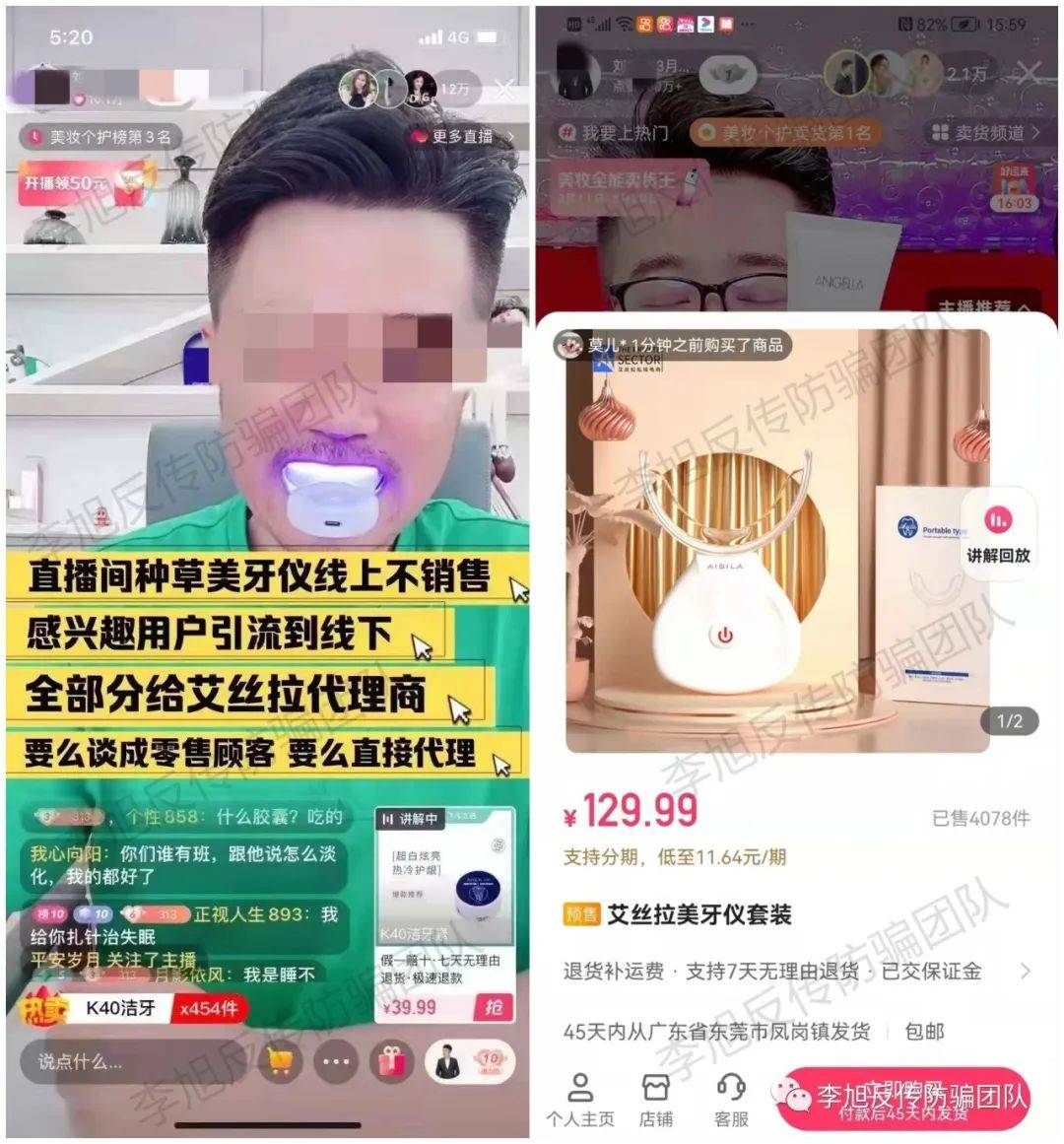 而李旭反傳防騙團(tuán)隊也在網(wǎng)上看到,針對網(wǎng)友提問“艾絲拉美牙儀效果怎么樣”浙江大學(xué)醫(yī)學(xué)院附屬第二醫(yī)院史偉萍回答到,艾絲拉美牙儀效果不一定有保證的,這種都屬于氧化劑,如果使用不當(dāng),會對牙齒造成敏感和疼痛,嚴(yán)重的情況還有可能造成牙神經(jīng)的發(fā)炎,牙齦也會被灼傷,出現(xiàn)潰爛。并建議到,美白牙齒是醫(yī)療操作,要正規(guī)醫(yī)院就診。