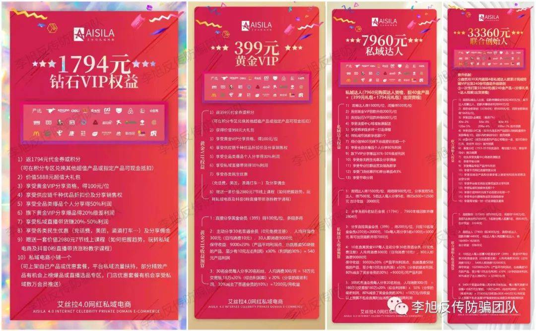 據(jù)代理們反饋,艾絲拉分為黃金VIP(399元)、鉆石VIP(1794元)、達(dá)人(7960元)、省代(也稱中級創(chuàng)業(yè)導(dǎo)師)(15920元)、聯(lián)創(chuàng)(33360元)、總代(111200元)六級代理,每一級拿貨價格不同,獎勵也不同。
