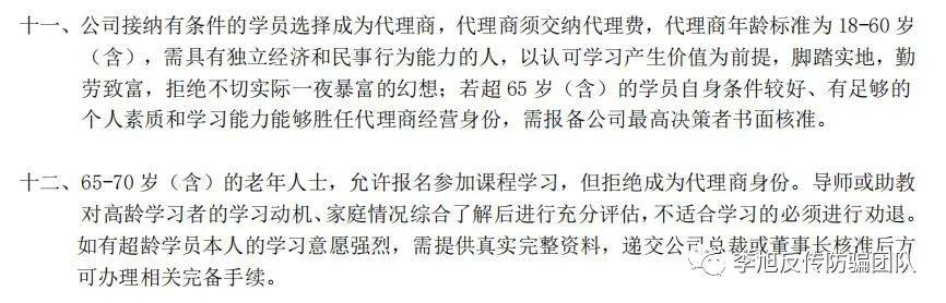 代理合同報課程須知中第十一點、十二點提到,代理商年齡標準為18-60歲(含),需具有獨立經(jīng)濟和民事行為能力的人。若超過65歲(含)的學(xué)員自身條件較好,需報備公司書面核準。65-70歲(含)的老年人士,允許報名參加課程學(xué)習(xí),但拒絕成為代理商身份。