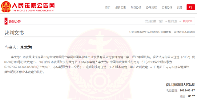 中國(guó)經(jīng)濟(jì)網(wǎng)北京3月30日訊 近日,人民法院公告網(wǎng)公布的一則裁判信息顯示,國(guó)基健康產(chǎn)業(yè)發(fā)展有限公司因涉嫌傳銷,淶源縣人民法院現(xiàn)裁定凍結(jié)相關(guān)人員的資金賬戶。