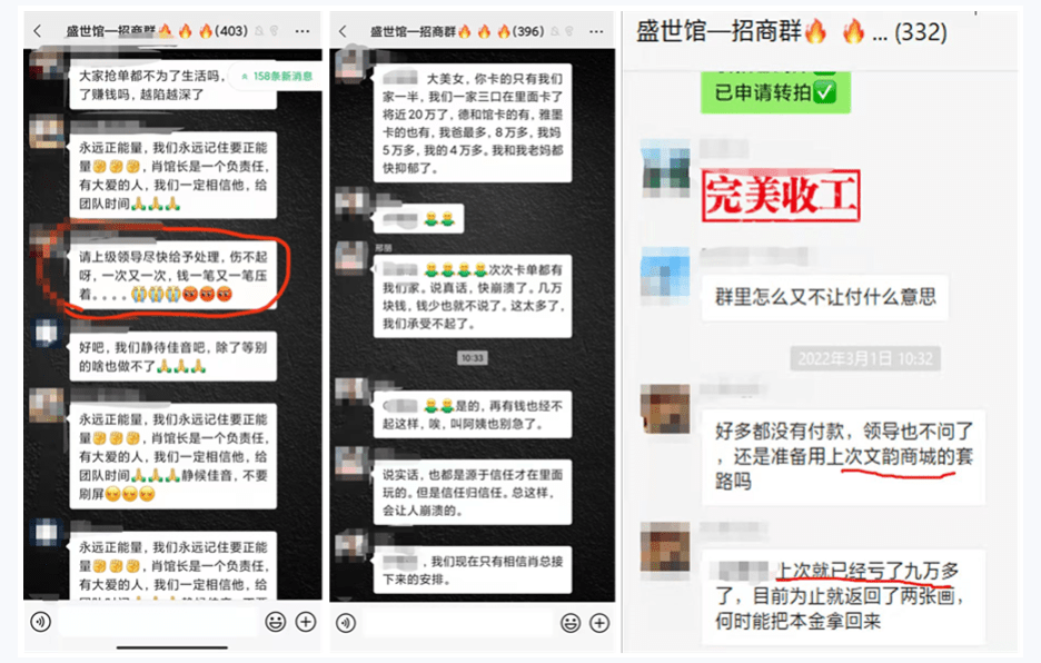 轉(zhuǎn)過天來,也就是3月1號,群主突然在群里說大家不要付款,平臺的系統(tǒng)出現(xiàn)了故障,要停兩天,他們正在處理讓大家等待通知。有些群里的人苦不堪言,抱怨發(fā)牢騷的人不在少數(shù),當(dāng)然也有許多人表示信任,與此同時小王那個群里突然有人提及到“這不會是準(zhǔn)備用之前文韻商城的套路吧?”看著這里小王一驚,趕緊去網(wǎng)上查了之前文韻商城的騙局,看完之后她想自己不會被騙了吧。