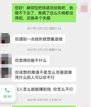 2021年12月13日,也就是近一個月后,明某察覺到該項目并無收益,并向“呂不”反饋問題。微信截圖顯示,“呂不”稱其工作做得不好,并表示“別人怎么能賺到錢,你怎么不行,你該想的難道不是怎么克服困難嗎?”明某希望退錢時,“呂不”的態(tài)度非常堅決:不存在退錢這種操作,并告訴他進群一天賺到錢的人很多。