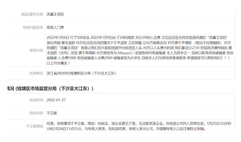 事后群內(nèi)不少成員向短視頻平臺反映過該問題,但“呂不”賬號被封停后,又有不斷“復(fù)活”的小號。于是,李輝等人向杭州盈夢文化傳媒合伙企業(yè)所在地杭州市錢塘區(qū)市場監(jiān)管分局進行投訴,也向警方報案。