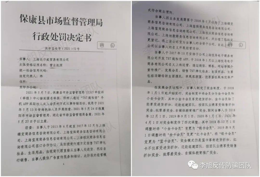 近日,李旭反傳防騙團(tuán)隊(duì)再次接到知情人士透露,其實(shí)在2021年9月,“TST庭秘密”就因涉嫌傳銷被保康縣市場(chǎng)監(jiān)督管理局行政處罰過(guò),立案信息在企查查依舊顯示。