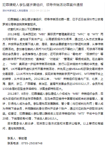 犯罪嫌疑人李弘健涉嫌組織、領(lǐng)導(dǎo)傳銷活動(dòng)罪一案,已于近日由深圳市公安局羅湖分局移送我院審查起訴。