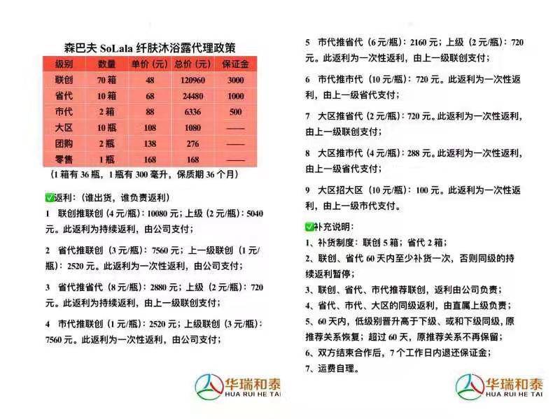 看過傳銷類文章的人都知道具備以下三點就可以認定涉嫌傳銷: 一是交納或變相交納入門費,即交錢加入后才可獲得計提報酬和發(fā)展下線的“資格”; 二是直接或間接發(fā)展下線,即拉人加入,并按照一定順序組成層級; 三是上線從直接或間接發(fā)展的下線的銷售業(yè)績中計提報酬,或以直接或間接發(fā)展的人員數(shù)量為依據(jù)計提報酬或者返利。 從上圖中的代理策略來看,很明顯,森巴夫的制度已經(jīng)涉嫌傳銷。 森巴夫依然活躍于市場中,望廣大網(wǎng)友處處留心,謹防上當受騙。 在前幾年的報道中,我們發(fā)現(xiàn)有網(wǎng)友提及到:“森巴夫公司將(SOLala纖膚沐浴露)改頭換面轉(zhuǎn)型為睡啦啦,換湯不換藥,其目的很簡單,就是為了重新發(fā)展新的代理商收刮不義之財,企圖坑害廣大的會員和消費者。更惡劣的行為是將會員存入公司的提貨余款隨意轉(zhuǎn)移他人,嚴重的強盜行為?!?/p>