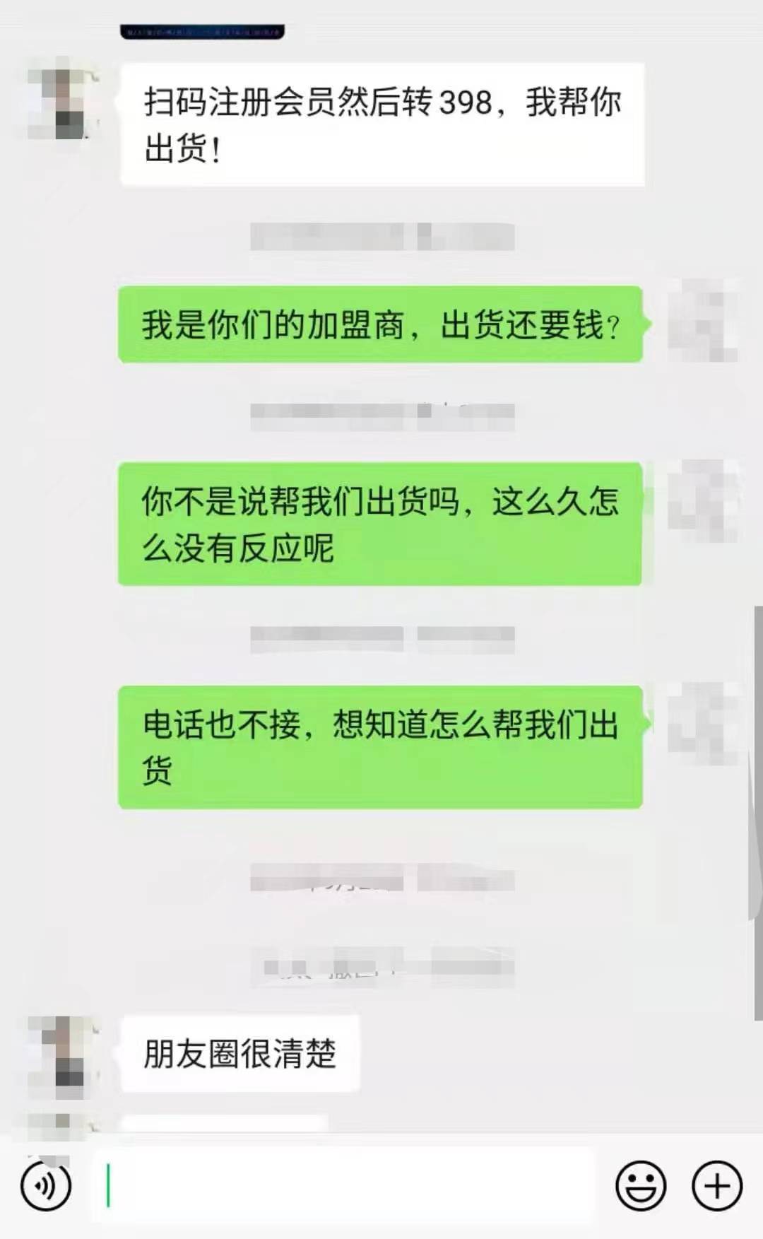 得知這個消息后,小何的妹妹便拉著小何去參加招商,原本小何對這些并不感興趣,但在妹妹的勸說下,小何最后還是加入了他們,并在4月5號向?qū)Ψ酱蚩?20960元,成為了聯(lián)創(chuàng)級別的會員,在這之后小何妹妹還招了一個聯(lián)創(chuàng)級別會員的人,得到了公司10080元的獎勵。原以為這會是一次賺錢的機會。 但交完錢后,該公司陸陸續(xù)續(xù)的給她們發(fā)了一些貨后,當初招商的這些人就聯(lián)系不上了,過了兩個月后小何發(fā)現(xiàn),再聯(lián)系當初收她錢的鄒某全和劉某杰,人根本聯(lián)系不上,更別說見面了,意識到不對勁的小何得知他們要去廣東了,就和另外一個會員追去了廣東,在那里小何終于見到了他們,那時候張某強打電話給李老三和任某月來處理這件事情,等他們都到了,也沒能解決,錢也沒退,貨也退不了。