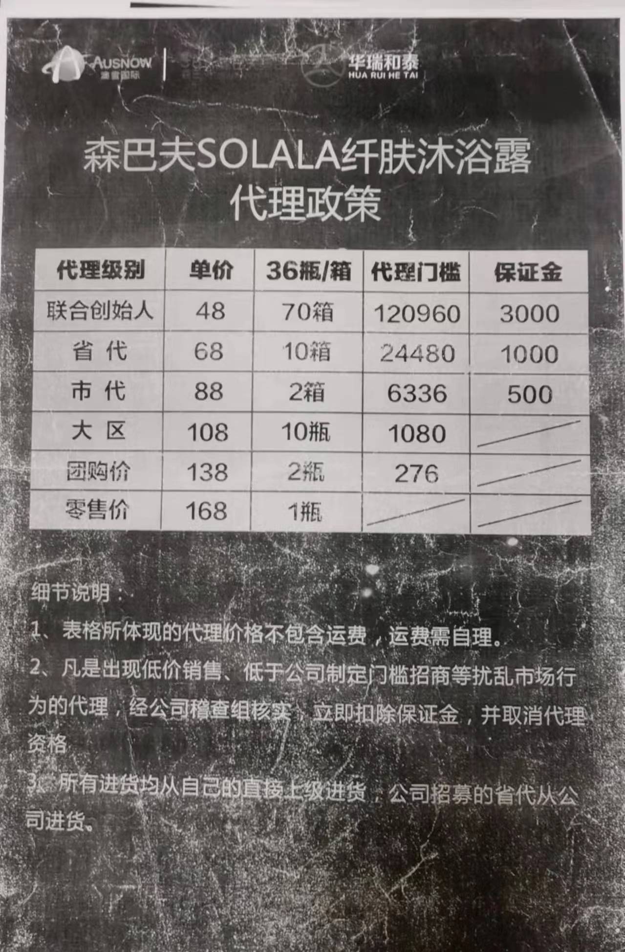 而據(jù)了解,森巴夫公司主要生產(chǎn)洗滌用品,化妝品為主導產(chǎn)品,其中所生產(chǎn)的(SOLala纖膚沐浴露)一款,公司將不定期的向社會召開招商會議,公開宣傳和文字性的廣告圖片進行大肆宣導使用瘦啦啦沐浴露能有減肥瘦身及多種功效,例如:減肥;塑身;保持身材;美白;嫩膚養(yǎng)膚;保持留香;緊致肌膚;淡化妊娠紋;暖宮調(diào)理婦科;血液循環(huán);新陳代謝數(shù);疏通經(jīng)絡,調(diào)理胃腸功能;排濕排寒排毒祛風;緩解頸椎病關(guān)節(jié)等。
