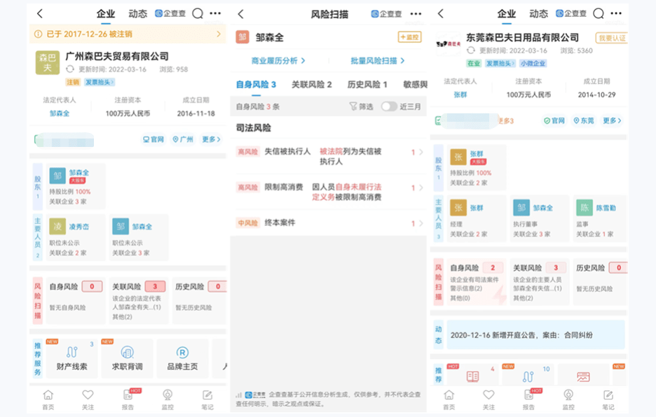 見很多會員反映貨賣不出去,那些人就又搞了一個清貨群,一邊繼續(xù)招代理一邊把老代理賣不掉的貨以(幫忙賣)收回去繼續(xù)招代理。不僅如此,這些人還和小何這樣的老會員要錢才肯出貨。 小何說看到這她才明白,這些人的目的不是為了賣沐浴露,而是發(fā)展會員。小何見和他們多次協(xié)調(diào)無果,就將他們告上法院,上訴的過程中,小何才發(fā)現(xiàn)原來已經(jīng)有那么多的受害者起訴了該公司。 多次起訴無果,小何和那些人都沒有放棄,最終在今年4月份小何告訴我們她的官司贏了,但是還有一筆錢沒有算上,她決定繼續(xù)上訴。 商品虛假宣傳,制度涉嫌傳銷 據(jù)企查查顯示,小何之前提到的鄒某全,他作為法人代表的廣州森巴夫貿(mào)易公司早已經(jīng)被注銷,而他本人更是已經(jīng)被法院列為失信被執(zhí)行人。但他的名字依然出現(xiàn)在現(xiàn)在的東莞森巴夫日用品有限公司的主要人員列表里。這樣的人參與企劃的產(chǎn)品真的能放心用嗎?