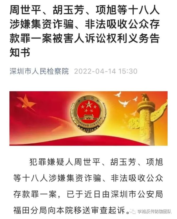 4月15日,記者從深圳市人民檢察院微信公眾號(hào)了解到,備受關(guān)注的紅嶺創(chuàng)投案件有了最新進(jìn)展。犯罪嫌疑人周世平、胡玉芳、項(xiàng)旭等十八人涉嫌集資詐騙、非法吸收公眾存款罪一案,已于近日由深圳市公安局福田分局向深圳市人民檢察院移送審查起訴。