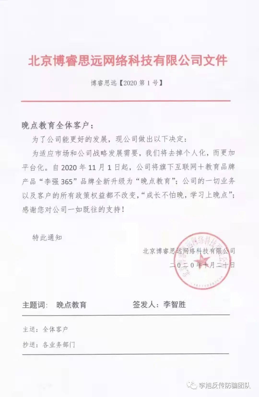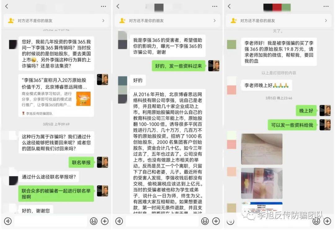 發(fā)表時間:2022-04-18 20:11作者:李旭反傳防騙團隊來源:李旭反傳防騙團隊 2019年初,李旭反傳防騙團隊發(fā)文曝光“李強365”公開宣傳原始股,高收益誘導(dǎo)不明真相的普通人參與,主體公司北京博睿思遠(yuǎn)網(wǎng)絡(luò)科技有限公司(以下簡稱北京博睿公司)有涉嫌非法集資的可能。 (相關(guān)鏈接“李強365”宣稱月入20萬原始股價值千萬,北京博睿思遠(yuǎn)網(wǎng)絡(luò)科技公司涉嫌非法集資) 文章發(fā)布之后,收到一些網(wǎng)友的咨詢,是否真涉嫌非法集資?已經(jīng)參與了怎么辦?當(dāng)我們以為事情就這樣過去,該公司也消停了的時候,我們接到多位網(wǎng)友反饋,之前被忽悠購買“李強365”所謂創(chuàng)始股東,公司沒上市不說,一直也不給大家退股。