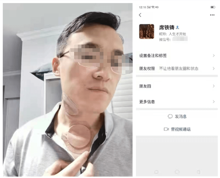 被騙之后,心里很慌,想盡辦法,又加上了另一個(gè)微信號(hào)的席鐵鑄,前后2個(gè)號(hào)的聊天內(nèi)容和話術(shù),套路一模一樣。裝可憐,打點(diǎn)滴,貼膏藥的視頻圖片如出一轍,難道他一年四季都貼膏藥,打點(diǎn)滴嗎?