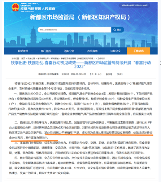 “某公司涉嫌以‘蘆筍植萃’產(chǎn)品、虛擬幣為道具從事違法經(jīng)營活動立案調(diào)查,依法凍結(jié)涉?zhèn)髻Y金6000萬元,案件正在辦理當(dāng)中?!?/p>