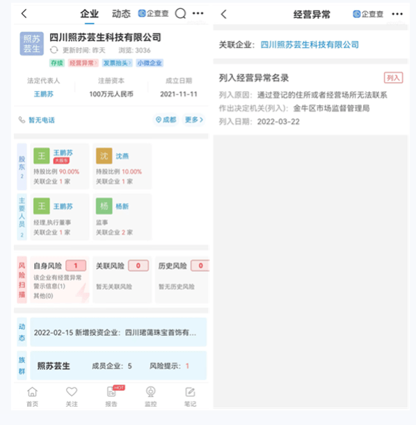 據(jù)企查查發(fā)現(xiàn),四川照蘇蕓生科技有限公司成立于2021年11月11日,法定代表人為王鵬蘇,注冊資本100萬元人民幣,實繳資本0元,而該公司卻在2022年3月22日被金牛區(qū)市場監(jiān)管局以“通過登記的住所或者經(jīng)營場所無法聯(lián)系”為由,列入了經(jīng)營異常名錄。