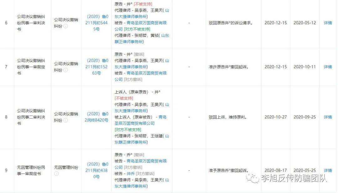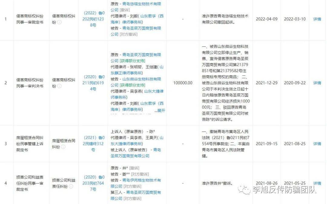 根據(jù)網(wǎng)友提供的資料,李旭反傳防騙團(tuán)隊(duì)進(jìn)行一番了解。 創(chuàng)始人對(duì)簿公堂 “悠塔”屬于青島圣辰萬國(guó)商貿(mào)有限公司旗下的微商品牌,該公司成立于2016年,是由90后年出貨過億級(jí)別的微商界元老創(chuàng)始人喬瑱、井喬、韓雅頔、安芳菲(四人各占股25%)創(chuàng)立的一家經(jīng)營(yíng)纖體塑形產(chǎn)品、護(hù)膚品、化妝品等的民營(yíng)企業(yè),總部設(shè)立在青島。 然而自2020年開始,幾位創(chuàng)始人卻因“無因管理糾紛(沒有法定或者約定義務(wù)的一方為了避免他人的利益受損而自愿管理他人事務(wù)或者提供服務(wù)所發(fā)生的糾紛)”“公司決議撤銷糾紛(股東以公司股東大會(huì)、董事會(huì)召集程序、表決方式違法或違反公司章程、或者決議內(nèi)容違法公司章程為由請(qǐng)求法院撤銷決議而產(chǎn)生的糾紛)”“損害公司利益責(zé)任糾紛(損害公司利益責(zé)任糾紛)”“侵害商標(biāo)權(quán)糾紛”等案由對(duì)簿公堂。