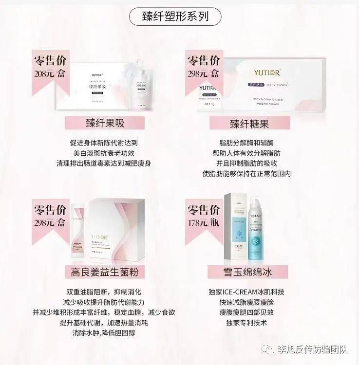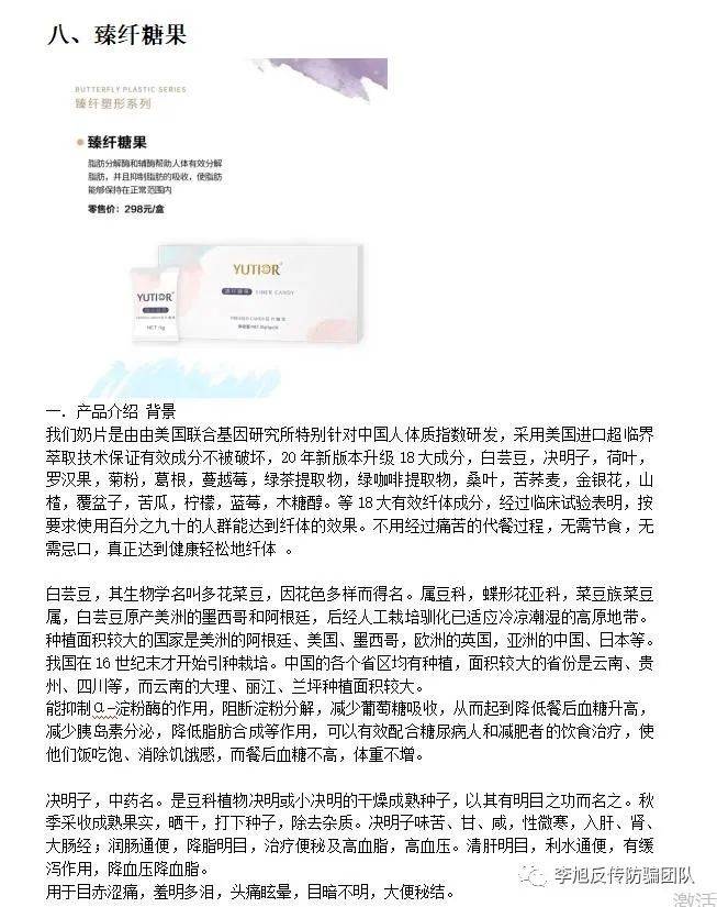 虛假、夸大宣傳 在“悠塔”代理們的朋友圈,經(jīng)常有現(xiàn)身說法的“案例”,誰誰誰吃了奶片、果吸后,兩個(gè)月瘦了15斤,且體脂率降了10%,BMI降了1.15%,連內(nèi)臟脂肪都低落了8.6% 李旭反傳防騙團(tuán)隊(duì)調(diào)查發(fā)現(xiàn),奶片全稱為“YUTIOR臻纖糖果”,果吸全稱為“YUTIOR臻纖果吸”,而這兩款產(chǎn)品都只是普通食品類備案,并沒有藥品或者是保健品的認(rèn)證。