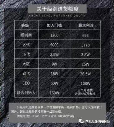 △某代理提供的宣傳資料 根據(jù)《食品廣告發(fā)布暫行規(guī)定》相關(guān)規(guī)定,食品廣告不得出現(xiàn)與藥品想混淆的用語,不得直接或者間接地宣傳治療作用,也不得借用宣傳某些成分的作用明示或者暗示該食品的治療作用;普通食品、新資源食品、特殊營(yíng)養(yǎng)食品廣告不得宣傳保健功能,也不得借助宣傳某些成分的作用明示或者暗示其保健作用。 很明顯,悠塔產(chǎn)品的廣告宣傳已經(jīng)違反了相關(guān)規(guī)定,涉嫌虛假、夸大宣傳。 模式涉嫌傳銷 悠塔吸引代理的方式除了上述提到的虛假宣傳之外,宣傳暴富也是其手段之一。 據(jù)網(wǎng)友反饋,悠塔設(shè)置了7個(gè)層級(jí)的代理,分別為經(jīng)銷商、區(qū)代、市代、大區(qū)、省代、CEO及聯(lián)合創(chuàng)始人。每個(gè)代理的加入門檻各不相同,從1200元到160W不等。網(wǎng)友提到,之前最低的門檻費(fèi)是800,去年開始提到了1200元。