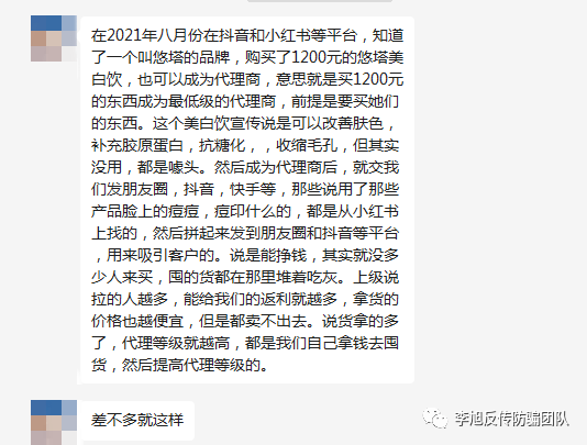 發(fā)表時(shí)間:2022-05-07 20:15作者:李旭反傳防騙團(tuán)隊(duì)來源:李旭反傳防騙團(tuán)隊(duì) “一個(gè)周期皮膚明顯變白” “從大黃皮到白皮的逆襲” “不僅皮膚變好變得細(xì)膩,還會(huì)提高你的睡眠質(zhì)量” ...... 看到這樣的宣傳,你是不是有點(diǎn)心動(dòng)呢?小心這就是忽悠人的虛假、夸大宣傳。 近日,李旭反傳防騙團(tuán)隊(duì)接到網(wǎng)友反饋,稱家人加入了一個(gè)名為“悠塔”的微商團(tuán)隊(duì),宣傳他們的產(chǎn)品可以改善膚色,補(bǔ)充膠原蛋白,抗氧化,收縮毛孔等功效,而且成為代理之后,可賺錢,級(jí)別越高,返利越多,拿貨價(jià)也越便宜。