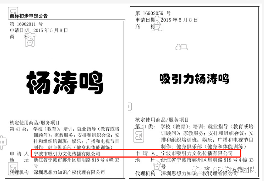發(fā)表時(shí)間:2022-05-24 22:09作者:上游新聞來源:上游新聞 5月20日,“李旭反傳防騙團(tuán)隊(duì)”在微信公眾號(hào)發(fā)推文《我們被“成功學(xué)”大師楊濤鳴及吸引力公司起訴了》。 5月21日,李旭告訴上游新聞?dòng)浾撸骸靶安粔赫?,我們長期從事反傳銷防騙宣傳,被曝光企業(yè)起訴已經(jīng)不是第一次了,之前也有同類型的幾個(gè)上訴,都被法院駁回。我們正在搜集材料積極應(yīng)訴,有把握勝訴的可能性很大?!?/p> 5月22日,吸引力公司法定代表人張偉玉向上游新聞?dòng)浾咦C實(shí):“起訴屬實(shí),具體起訴情況要問楊濤鳴老師的助理?!?/p> 反傳銷文章被起訴: 文內(nèi)稱精神傳銷危害大,有網(wǎng)友被洗腦 5月21日,上游新聞?dòng)浾呗?lián)系上李旭,他告訴記者:“4月25日,我們根據(jù)網(wǎng)友反饋信息,發(fā)布了《精神傳銷危害大,網(wǎng)友陷入中谷道傳銷,又被楊濤鳴“洗腦”》文章,5月17日,我接到寧波市江北區(qū)人民法院的電話,在確認(rèn)相關(guān)信息后,法院發(fā)來民事起訴狀和應(yīng)訴(舉證)通知書?!?/p> 記者從民事起訴狀上看到,原告為浙江吸引力文化傳播有限公司(簡稱:吸引力公司),被告分別是“北京思路通信信息咨詢有限公司”(“李旭反傳防騙團(tuán)隊(duì)”微信公眾號(hào)認(rèn)證主體,記者注)和李旭。 吸引力公司起訴稱:“4月25日以來,被告以名為‘李旭反傳防騙團(tuán)隊(duì)’或‘李旭反傳銷’的賬號(hào)在騰訊、百度、搜狐、知乎等多個(gè)平臺(tái)發(fā)布標(biāo)題為《精神傳銷危害大,網(wǎng)友陷入中谷道傳銷,又被楊濤鳴“洗腦”》的文章,故意捏造事實(shí),嚴(yán)重降低了原告公司以及原告公司旗下楊濤鳴及其系列課程的社會(huì)評(píng)價(jià),損害了原告公司的名譽(yù)權(quán)。為維護(hù)原告的合法權(quán)益,特向貴院起訴?!痹凇霸V訟請求”一欄,上游新聞?dòng)浾哂浾呖吹?,吸引力公司提?項(xiàng)請求: 1、全面刪除其發(fā)布的侵害原告名譽(yù)權(quán)的文章; 2、在上述網(wǎng)絡(luò)平臺(tái)連續(xù)十日發(fā)布道歉聲明,向原告賠禮道歉,消除影響,恢復(fù)名譽(yù); 3、向原告賠償10萬元; 4、被告承擔(dān)本案訴訟費(fèi)等費(fèi)用。 據(jù)上游新聞?dòng)浾吡私?,“李旭反傳防騙團(tuán)隊(duì)”負(fù)責(zé)人李旭長期從事反傳防騙宣傳活動(dòng)。去年12月24日,“李旭反傳防騙團(tuán)隊(duì)”微信公眾號(hào)發(fā)布某明星企業(yè)涉?zhèn)鞯奈恼潞?,引發(fā)各大媒體爭相報(bào)道,明星夫婦也因此陷入輿論漩渦。 原告公司主打職業(yè)培訓(xùn): 前身為文傳公司,主推“楊濤鳴”系列課程 吸引力公司的起訴狀稱,“公司長期致力于為廣大客戶提供各行業(yè)類培訓(xùn),擁有多元化、多層次的服務(wù)體系及培訓(xùn)產(chǎn)品。2019年11月16日,原告受讓名為‘楊濤鳴’‘吸引力楊濤鳴’等注冊商標(biāo),楊濤鳴及其系列課程系原告公司主推的商務(wù)品牌與重要課程,經(jīng)過多年經(jīng)營,在市場上取得了一定知名度。原告為此付出了大量人力物力財(cái)力。” 天眼查App顯示,吸引力公司成立于2019年1月18日,注冊資本1000萬元,實(shí)繳資本613.3萬元,注冊地址在浙江省寧波市江北區(qū)同濟(jì)路169號(hào)16-1-33室,張偉玉任法定代表人和公司執(zhí)行董事、經(jīng)理,持股10%,田文蘭任公司監(jiān)事持股90%。 上游新聞?dòng)浾邚膰夜ど炭偩稚虡?biāo)綜合查詢到,起訴狀中提及的“楊濤鳴”“吸引力楊濤鳴”商標(biāo)于2015年5月8日注冊,申請人為“寧波市吸引力文化傳播有限公司”。天眼查APP顯示,寧波吸引力文化傳播有限公司,曾用名寧波市鄞州渦輪文化傳播有限公司, 2012年12月18日成立,張偉玉任公司法定代表人、執(zhí)行董事兼總經(jīng)理,占股7%,田文蘭出任監(jiān)事占股93%,公司在2019年1月17日注銷。