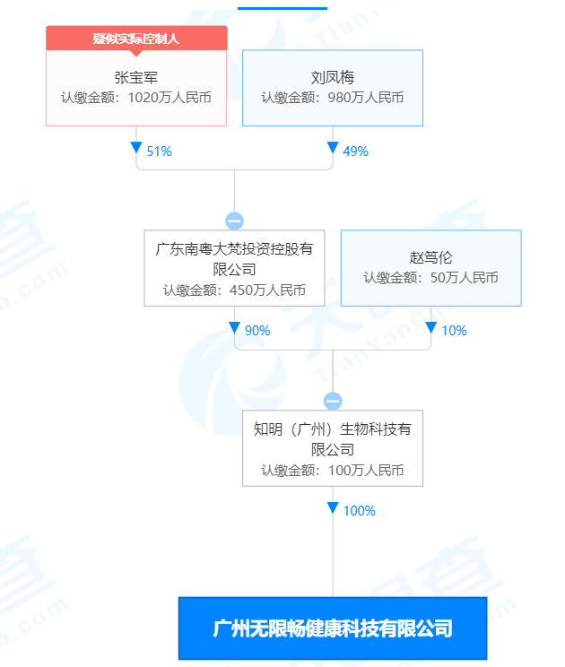 天眼查APP資料顯示,廣州無(wú)限暢健康科技有限公司為知明(廣州)生物科技有限公司全資子公司。知明(廣州)生物科技有限公司則由廣東南粵大梵投資控股有限公司、趙篤倫分別持股90%、10%,趙篤倫也是知明(廣州)生物科技有限公司的法定代表人。廣東南粵大梵投資控股有限公司則由張寶軍、劉鳳梅分別持股51%、49%。