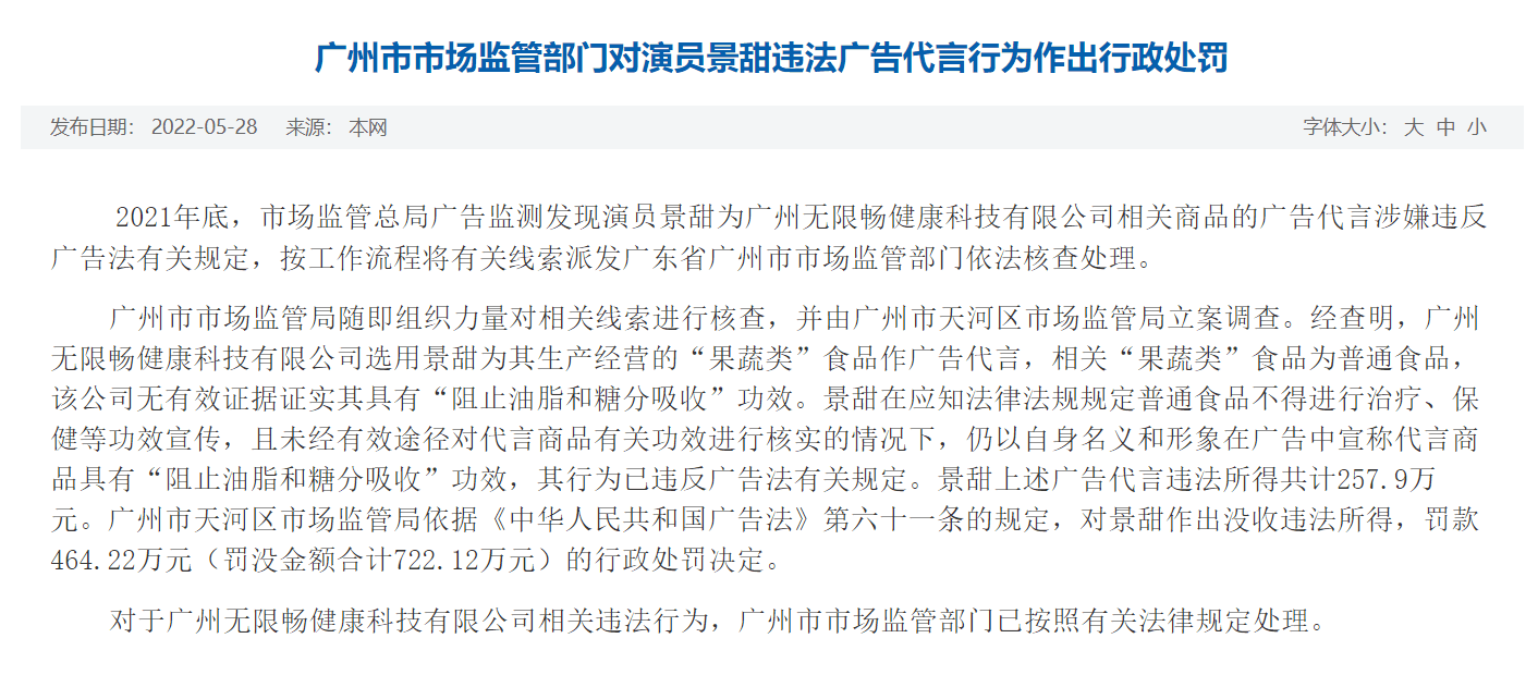中國(guó)經(jīng)濟(jì)網(wǎng)北京5月31日訊 近日,廣州市市場(chǎng)監(jiān)督管理局發(fā)布廣州市市場(chǎng)監(jiān)管部門(mén)對(duì)演員景甜違法廣告代言行為作出行政處罰的公告。2021年底,市場(chǎng)監(jiān)管總局廣告監(jiān)測(cè)發(fā)現(xiàn)演員景甜為廣州無(wú)限暢健康科技有限公司相關(guān)商品的廣告代言涉嫌違反廣告法有關(guān)規(guī)定,按工作流程將有關(guān)線(xiàn)索派發(fā)廣東省廣州市市場(chǎng)監(jiān)管部門(mén)依法核查處理。