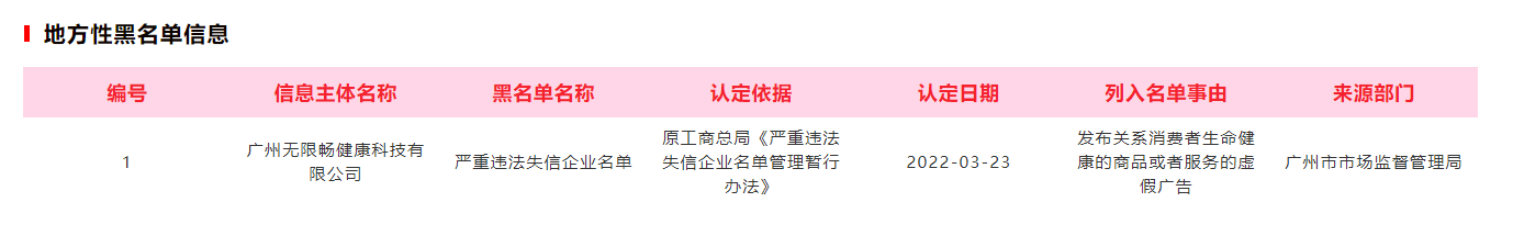 信用廣州網(wǎng)站顯示,廣州無(wú)限暢健康科技有限公司因發(fā)布關(guān)系消費(fèi)者生命健康的商品或者服務(wù)的虛假?gòu)V告,被廣州市市場(chǎng)監(jiān)督管理局認(rèn)定為嚴(yán)重違法失信企業(yè)。認(rèn)定日期為2022年3月23日。