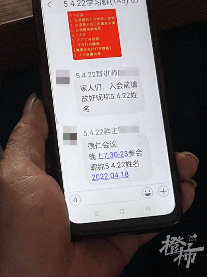 張大伯翻出聊天記錄,群名字是“5.4.22學(xué)習(xí)群”,聊天記錄顯示:“姓名;家人們,入會(huì)前請(qǐng)改好昵稱”“德仁會(huì)議晚上7:30-23……”