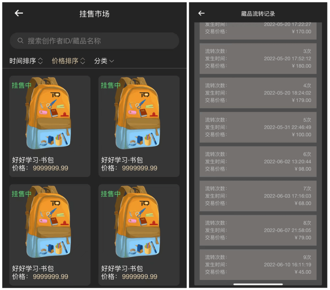6月11日,記者在天穹NFT的掛售市場(chǎng)上看到,多款標(biāo)價(jià)近1000萬元的“好好學(xué)習(xí)·書包”藏品被掛售。其中一件藏品的流轉(zhuǎn)記錄顯示,其在6月10日的交易價(jià)格僅為45元。