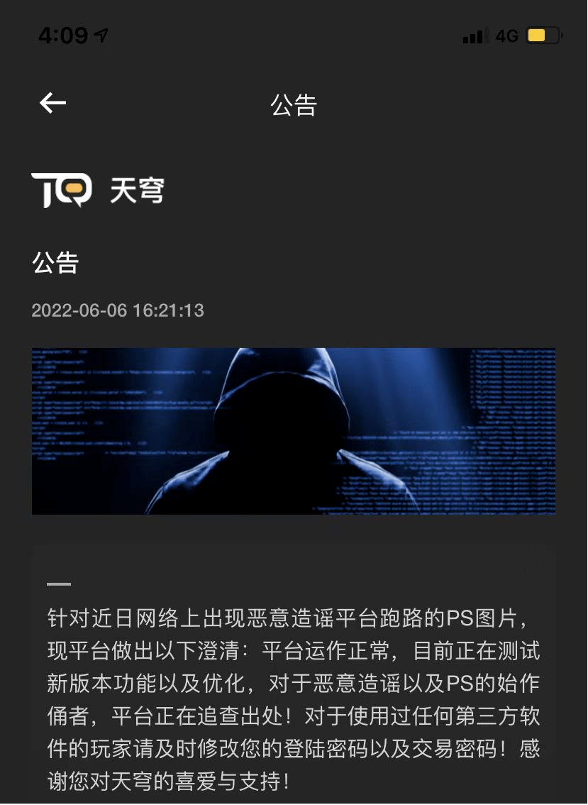 隨后,天穹NFT官方發(fā)布公告稱,平臺(tái)運(yùn)行正常,網(wǎng)上圖片系“惡意造謠平臺(tái)跑路的PS圖片”。