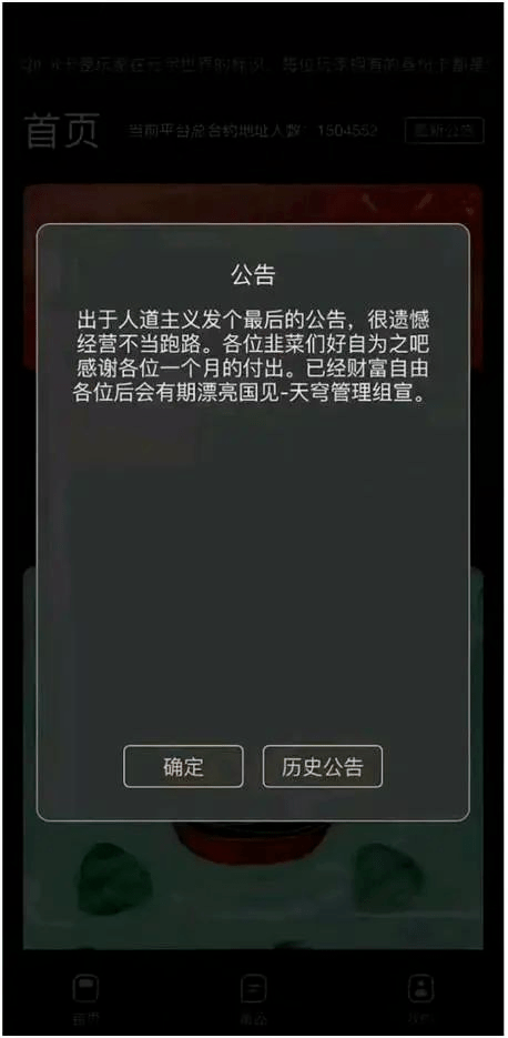 “出于人道主義發(fā)個(gè)最后的公告,很遺憾由于經(jīng)營不當(dāng)跑路?!苯眨粡堃伤茻衢T交易平臺(tái)天穹NFT(原名“天穹數(shù)藏”)的公告截圖在數(shù)字藏品投資者群里流傳。