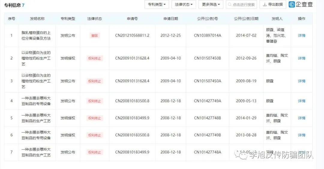 然而,李旭反傳防騙團(tuán)隊在相關(guān)網(wǎng)站上并沒有查詢到種豆生態(tài)公司有任何專利信息,據(jù)知情人士透露,此院士專利早前歸蘇州悅?cè)A生物科技有限公司所有。我們在企查查查詢到,目前相關(guān)專利狀態(tài)顯示為失效,因為專利權(quán)權(quán)屬糾紛問題,蘇州悅?cè)A生物科技有限公司還與顧*鬧上了法庭。上述知情人士提到,顧某已此專利先后跟多個工廠合作,涉及金額高達(dá)幾個億,而基本都是忽悠人的。