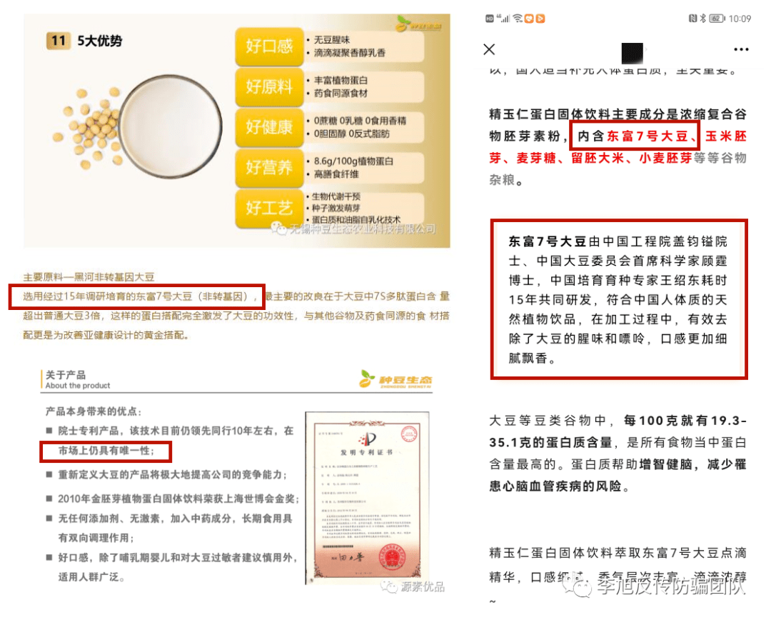 搜索濃縮復(fù)合谷物胚芽素粉,我們看到某直銷企業(yè)也有相關(guān)產(chǎn)品,這款名為保和堂精玉仁的蛋白固體飲料的主要成分是濃縮復(fù)合谷物胚芽素粉,內(nèi)含東富7號大豆、玉米胚芽、麥芽糖、留胚大米、小麥胚芽等谷物雜糧,而這個東富7號大豆就是上述文章中多提到的蓋院士及其他專家耗時15年共同研發(fā)的。除了沒有一直提到專利,其他宣傳與種豆生態(tài)幾乎如出一轍。