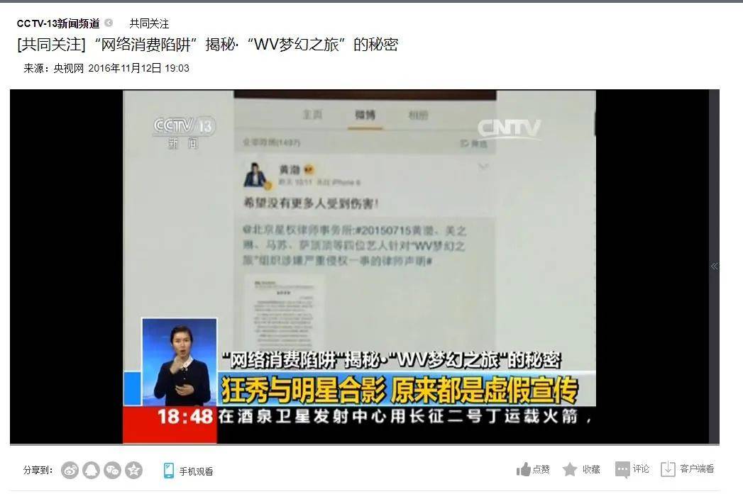 2016年11月12日,央視新聞?lì)l道,揭秘“WV夢(mèng)幻之旅”的秘密,揭秘“WV夢(mèng)幻之旅”涉嫌網(wǎng)絡(luò)傳銷(xiāo)。