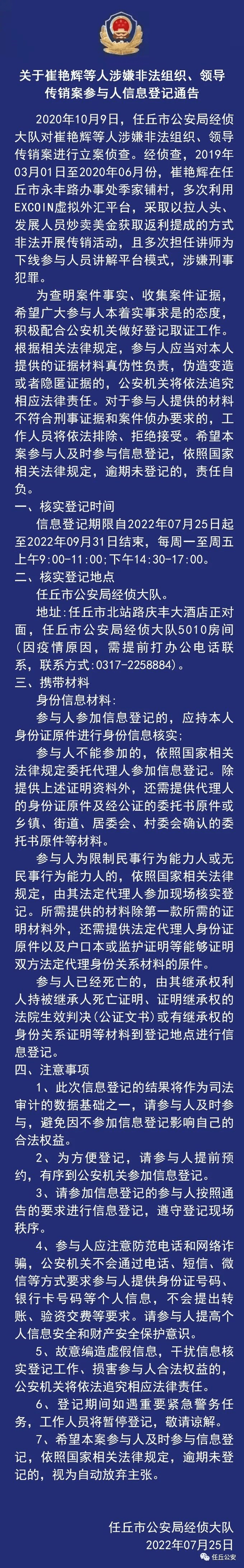 發(fā)表時間:2022-07-27 23:30作者:任丘公安來源:任丘公安 關于崔艷輝等人涉嫌非法組織、領導傳銷案參與人信息登記通告 2020年10月9日,任丘市公安局經偵大隊對崔艷輝等人涉嫌非法組織、領導傳銷案進行立案偵查。經偵查,2019年03月01日至2020年06月份,崔艷輝在任丘市永豐路辦事處季家鋪村,多次利用 EXCOIN虛擬外匯平臺,采取以拉人頭、發(fā)展人員炒賣美金獲取返利提成的方式非法開展傳銷活動,且多次擔任講師為下線參與人員講解平臺模式,涉嫌刑事犯罪。 為查明案件事實、收集案件證據(jù),希望廣大參與人本著實事求是的態(tài)度,積極配合公安機關做好登記取證工作。根據(jù)相關法律規(guī)定,參與人應當對本人提供的證據(jù)材料真?zhèn)涡载撠?,偽造變造或者隱匿證據(jù)的,公安機關將依法追究相應法律責任。對于參與人提供的材料不符合刑事證據(jù)和案件偵辦要求的,工作人員將依法排除、拒絕接受。希望本案參與人及時參與信息登記,依照國家相關法律規(guī)定,逾期未登記的,責任自負。 一、核實登記時間 信息登記期限自2022年07月25日起至2022年09月31日結束,每周一至周五上午9:00-11:00:下午14:30-17:00。 二、核實登記地點 任丘市公安局經偵大隊。 地址:任丘市北站路慶豐大酒店正對面,任丘市公安局經偵大隊5010房間(因疫情原因,需提前打辦公電話聯(lián)系)。 三、攜帶材料 身份信息材料 參與人參加信息登記的,應持本人身份證原件進行身份信息核實: 參與人不能參加的,依照國家相關法律規(guī)定委托代理人參加信息登記。除提供上述證明資料外,還需提供代理人的身份證原件及經公證的委托書原件或鄉(xiāng)鎮(zhèn)、街道、居委會、村委會確認的委托書原件等材料。 參與人為限制民事行為能力人或無民事行為能力人的,依照國家相關法律規(guī)定,由其法定代理人參加現(xiàn)場核實登記。所需提供的材料除第一款所需的證明材料外,還需提供法定代理人身份證原件以及戶口本或監(jiān)護證明等能夠證明雙方法定代理身份關系材料的原件 參與人已經死亡的,由其繼承權利人持被繼承人死亡證明、證明繼承權的法院生效判決(公證文書)或有繼承權的身份關系證明等材料到登記地點進行信息登記。 四、注意事項 1、此次信息登記的結果將作為司法審計的數(shù)據(jù)基礎之一,請參與人及時參與,避免因不參加信息登記影響自己的合法權益。 2、為方便登記,請參與人提前預約,有序到公安機關參加信息登記 3、請參加信息登記的參與人按昭通告的要求進行信息登記,遵守登記現(xiàn)場秩序。 4、參與人應注意防范電話和網絡詐騙,公安機關不會通過電話、短信、微信等方式要求參與人提供身份證號碼、銀行卡號碼等個人信息,不會提出轉賬、驗資交費等要求。請參與人提高個人信息安全和財產安全保護意識。 5、故意編造虛假信息,干擾信息核實登記工作、損害參與人合法權益的,公安機關將依法追究相應法律責任。 6、登記期間如遇重要緊急警務任務,工作人員將暫停登記,敬請諒解。 7、希望本案參與人及時參與信息登記,依照國家相關法律規(guī)定,逾期未登記的,視為自動放棄主張。 任丘市公安局經偵大隊 2022年07月25日 任丘公安