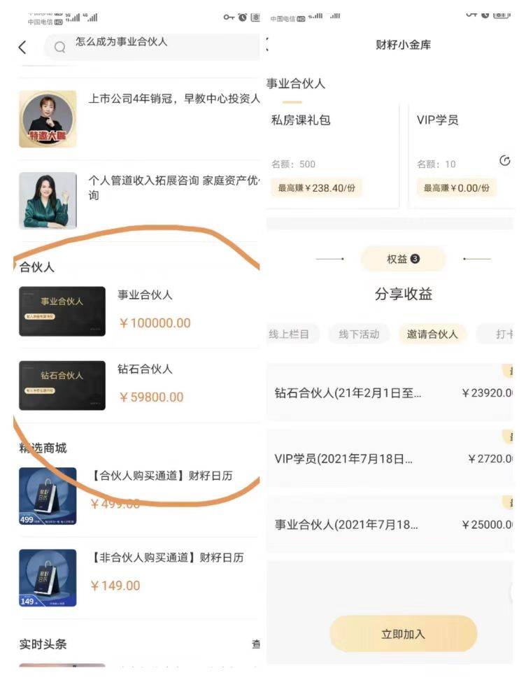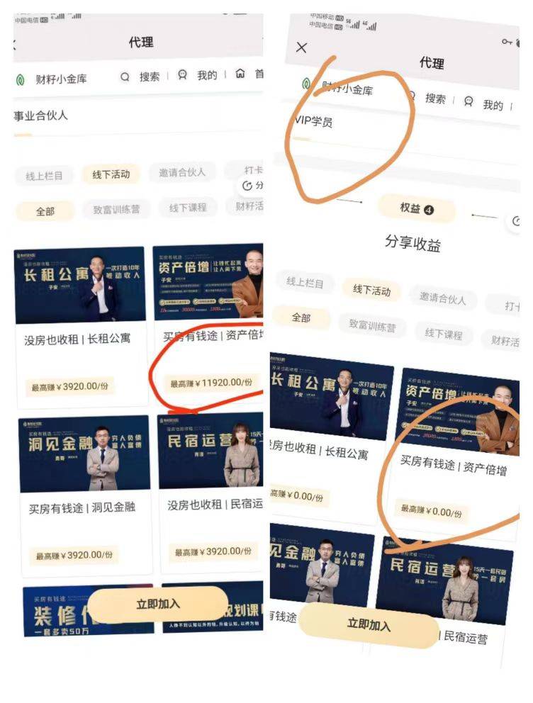 妻子禁不住誘惑,下載了這個“財籽”APP,并從上面購買了“買房有錢途|資產倍增”的課程,成為了他們的vip會員。購買課程后APP給發(fā)送了錄播課,讓自己學習提升等級??墒菦]過多久,李四發(fā)現事情遠沒有這么簡單。妻子在學習結束后,便會有導師告訴會員,可以通過不斷的學習來提升等級,等級高的會員每天賣課賺了多少多少錢,于是引誘學員繼續(xù)買課程學習升級。升級課程費用都在幾千到幾萬不等。
