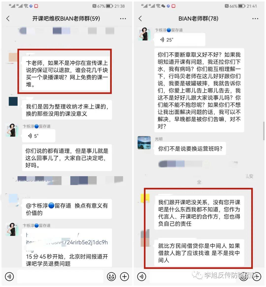 近日,有不少網(wǎng)友跟李旭反傳防騙團(tuán)隊(duì)反饋,被一個(gè)名叫“開(kāi)課吧”的線上學(xué)習(xí)平臺(tái)套路了,學(xué)習(xí)前承諾學(xué)完可退款或返還“激勵(lì)金”,可學(xué)習(xí)完之后承諾退還學(xué)費(fèi)遲遲沒(méi)有兌現(xiàn)。甚至有部分學(xué)員支付課程后幾個(gè)月沒(méi)有開(kāi)課,申請(qǐng)退費(fèi)也是一直沒(méi)有收到。
