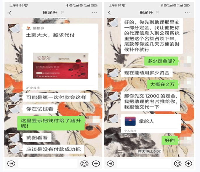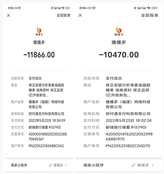 公司還推出了獎勵制度發(fā)展下線就有獎勵,(其實這就是一種傳銷的模式),就這樣前前后后洗腦十天后,我稀里糊涂的就把錢轉給了騙子,(被騙后才知道我們的轉賬都不是田涵升公司的賬戶,都是微信小程序播播多商城收款,以33盒蝦青素果糖名義,收取修正安媞爾雨生紅球藻飲料代理費,光沖這一點就足以證明這就是一個騙局)。收完代理費基本上打電話不接,微信基本上不回復,和失蹤差不多。