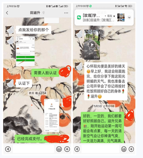 從5月1日開始微信聊的過程中,每天都是9點40分到10點,打卡式分享,有院子里種的月季花,有運動,美食,豪車停在豪宅門前,接恩師陳韻兆,一個月之內他母親過生日,送個一萬多的按摩椅,還有她女兒過生日送一個古箏,爭取我的意見合適不合適,隨后5月11日說建群,進取大家族,然后邀請我進群,剛進去有紅包雨,還有猜成語游戲,獎品為華為手機,獲獎得手機也是田涵升自己的托兒。